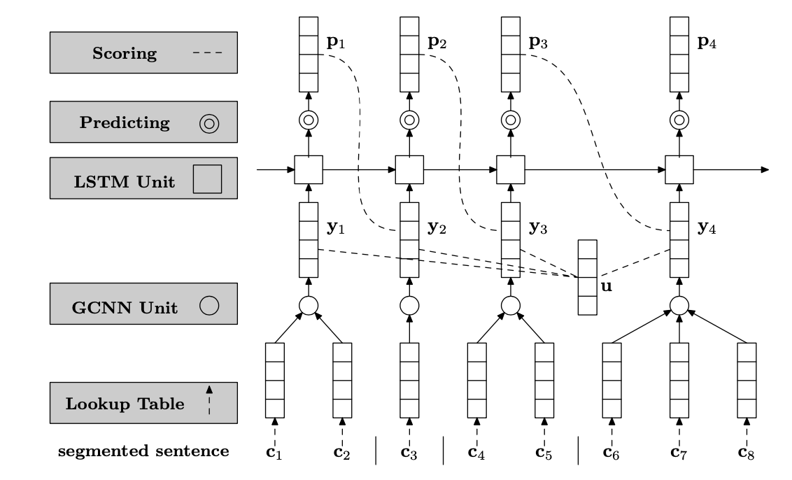 基于的框架如上图所示,不同于基于字符标注的模型,基于词的模型根据字符向量生成词向量。具体而言,模型得到输入的字符向量后,使用一个Gated Combination Neural Network,将L个字符向量组合,生成候选词向量: \[