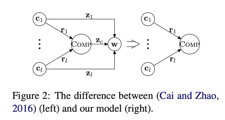 \(\mathbf{W}^{(L)} \in \mathbb{R}^{d \times L d}\) 和 \(\mathbf{r}_{i} \in \mathbb{R}^{d}(1 \leq i \leq L)\) 表示reset gates,用来决定字符向量的哪部分被结合到词向量中: \[ \left[\begin{array}{c} \mathbf{r}_{1} \\ \vdots \\ \mathbf{r}_{L} \end{array}\right]=\sigma\left(\mathbf{R}^{(L)}\left[\begin{array}{c} \mathbf{c}_{1} \\ \vdots \\ \mathbf{c}_{L} \end{array}\right]\right) \] 而update gate则是 \[ \left[\begin{array}{c} \mathbf{z}_{N} \\ \mathbf{z}_{1} \\ \vdots \\ \mathbf{z}_{L} \end{array}\right]=\exp \left(\mathbf{U}^{(L)}\left[\begin{array}{c} \hat{\mathbf{w}} \\ \mathbf{c}_{1} \\ \vdots \\ \mathbf{c}_{L} \end{array}\right]\right) \odot\left[\begin{array}{c} 1 / \mathbf{Z} \\ 1 / \mathbf{Z} \\ \vdots \\ 1 / \mathbf{Z} \end{array}\right] \] 其中\(\mathbf{U}^{(L)} \in \mathbb{R}^{(L+1) d \times(L+1) d}\) 是系数矩阵,\(\mathbf{Z} \in \mathbb{R}^{d}\)是归一化向量。