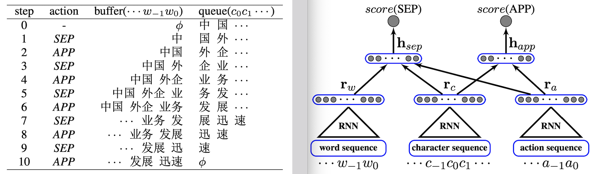 上图为Transition-Based分词方法,它使用Transition system递增地去分词。Buffer部分用于存储句子已经分词的部分,未分词的在Queue中。action包括SEP-separate和APP-append,分别指分割和把字符pop到Buffer中。模型分词的过程就是寻找一个action序列的过程。