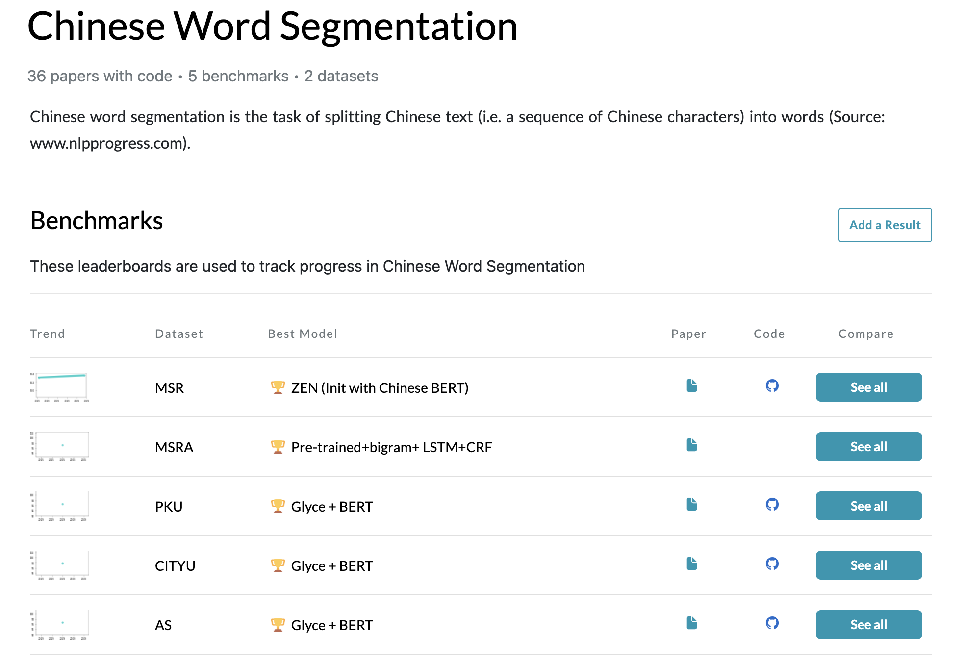 目前在几个公开数据集上分词模型的分词准确率都达到了97%以上。作为一个对于中文NLP来说非常重要的任务,中文分词可以说基于属于已经解决的任务,毕竟分词本就很难有绝对统一的标准。而就目前来说,相较于刷新榜单,或许更重要的是寻找更好解决OOV问题的方法(毕竟每段时间都有大量新词涌现)以及研发速度更快、体量更小的模型。